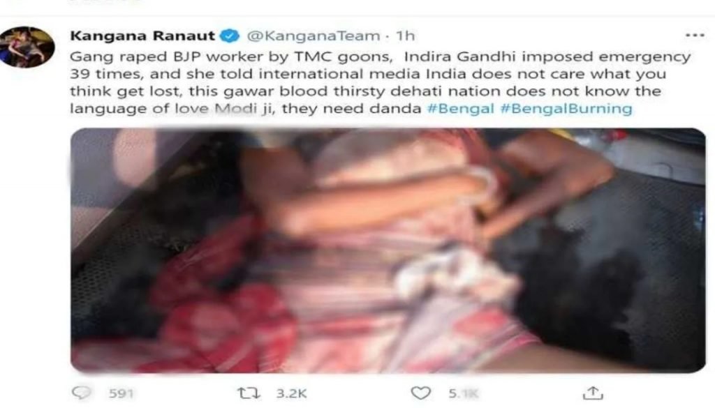 इसके अलावा कंगना ने ट्विटर पर बीजेपी की महिला नेता की तस्वीर शेयर कर यह दावा भी किया था कि टीएमसी के लोगों ने उसका गैंगरेप किया है। जिसके बाद उनका ट्विटर अकाउंट सस्पेंड कर दिया गया है। हालांकि, कंगना ने जिस महिला की तस्वीर शेयर की है उस महिला का चेहरा छुपाया हुआ था।