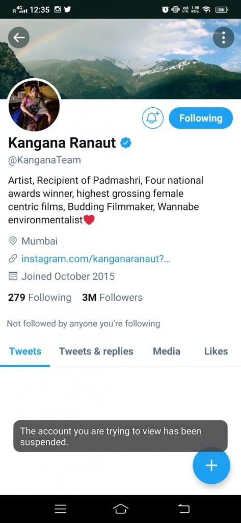 इससे पहले जनवरी में कंगना का ट्विटर अकांउट अस्थायी रूप से सस्पेंड किया गया था।